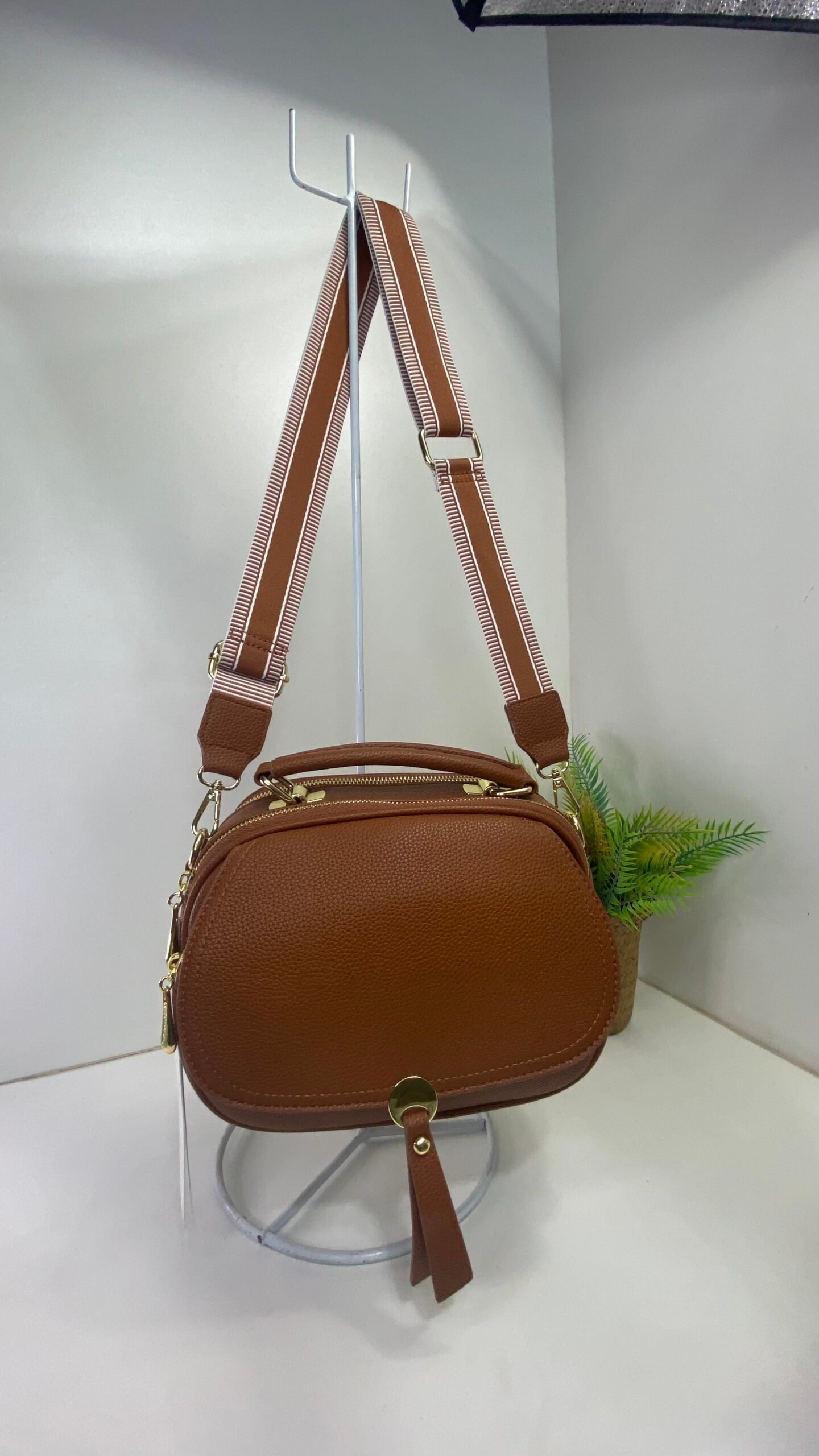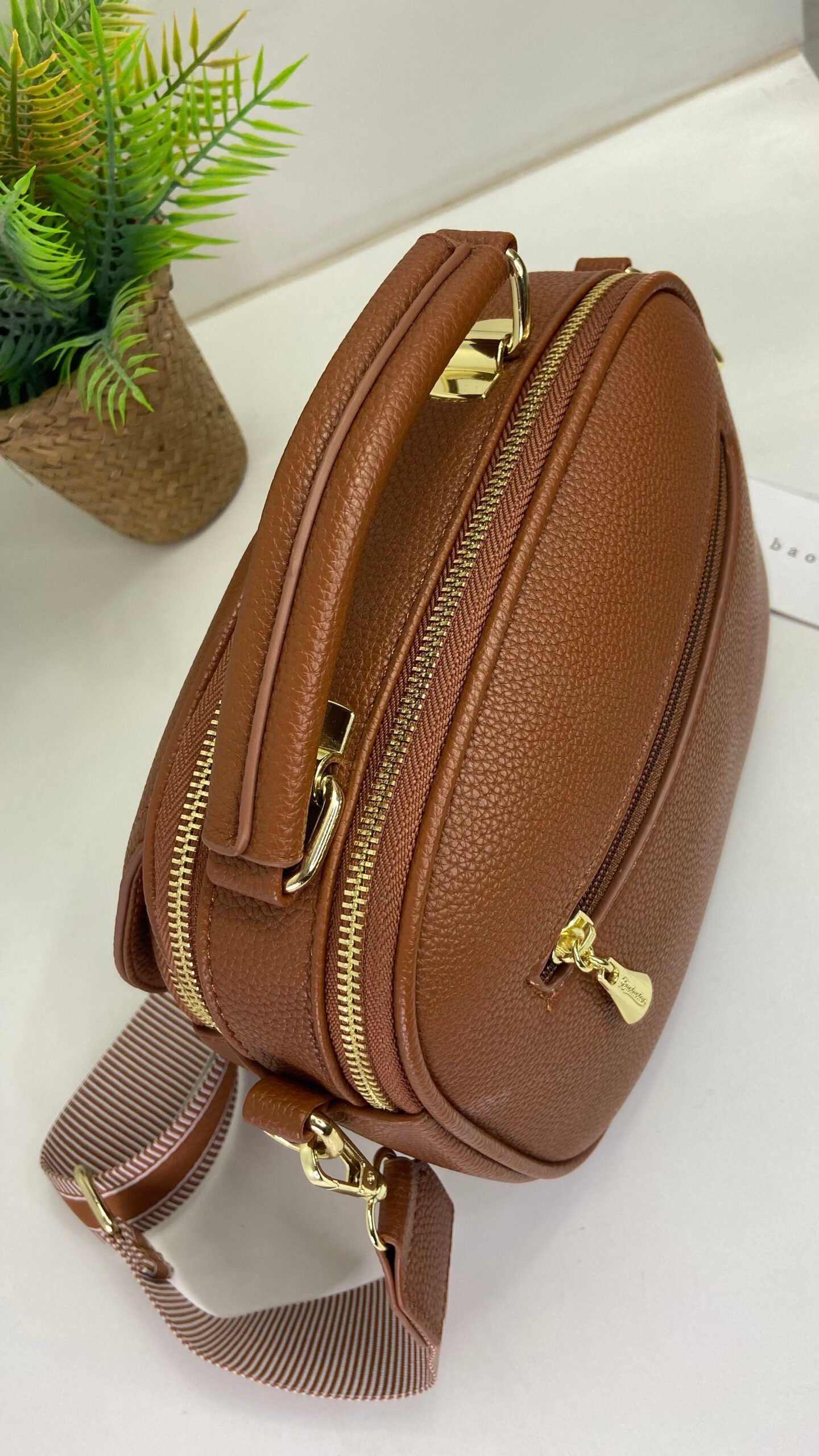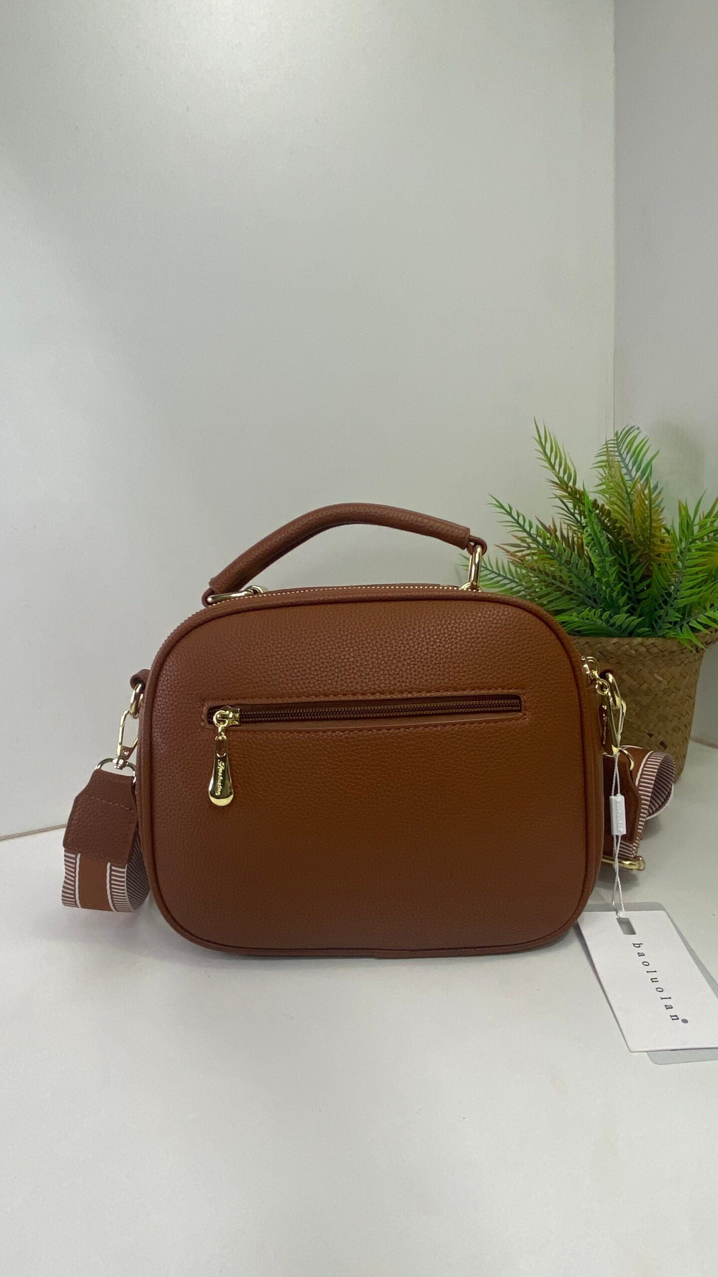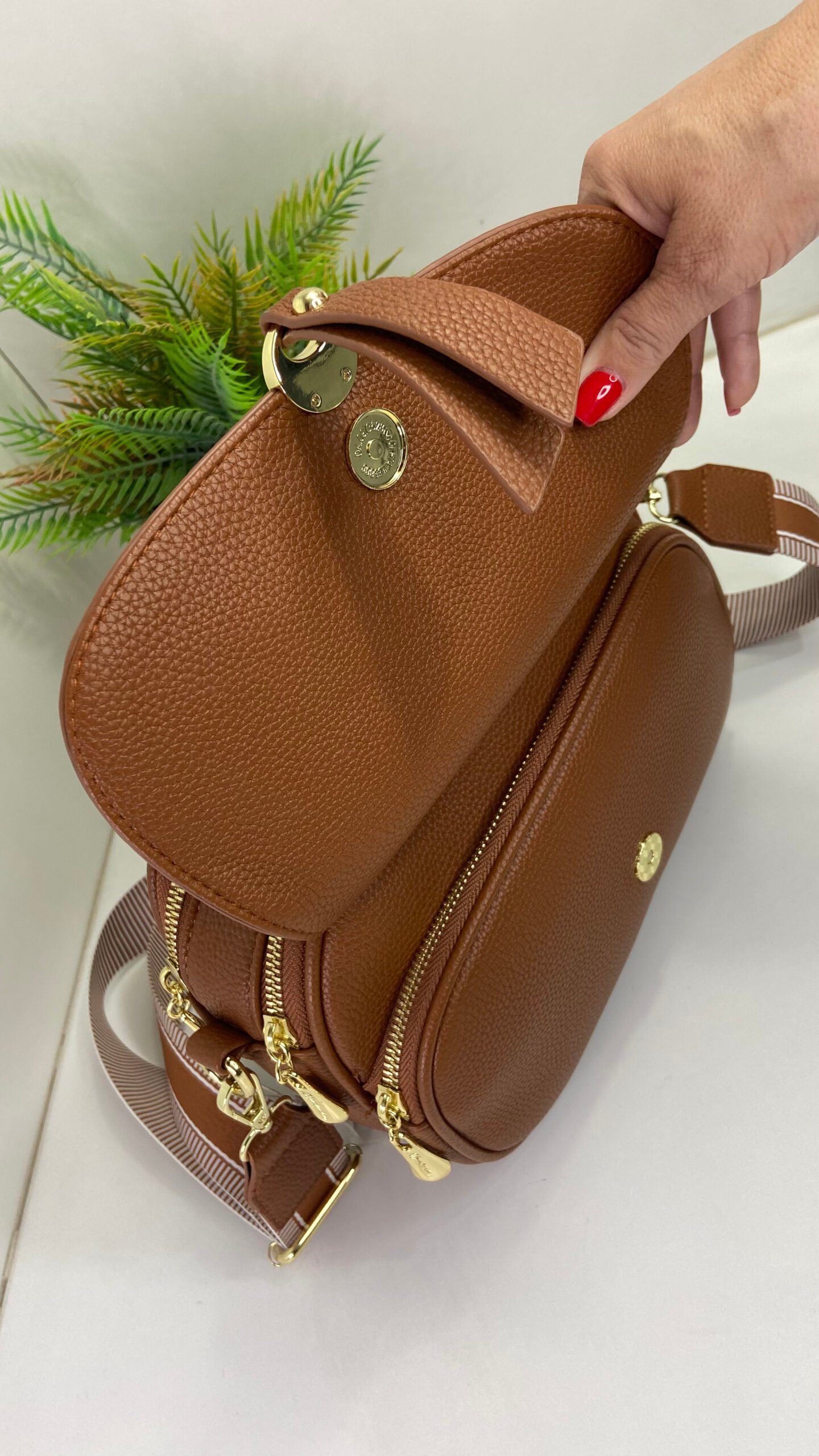 A bolsa com botâo dourado marrom è feita em couro sintètico alça em teçido ajustàvel e acabamento impecàvel une conforto e sofisticação garantindo combinações versàteis para diversas ocasiões