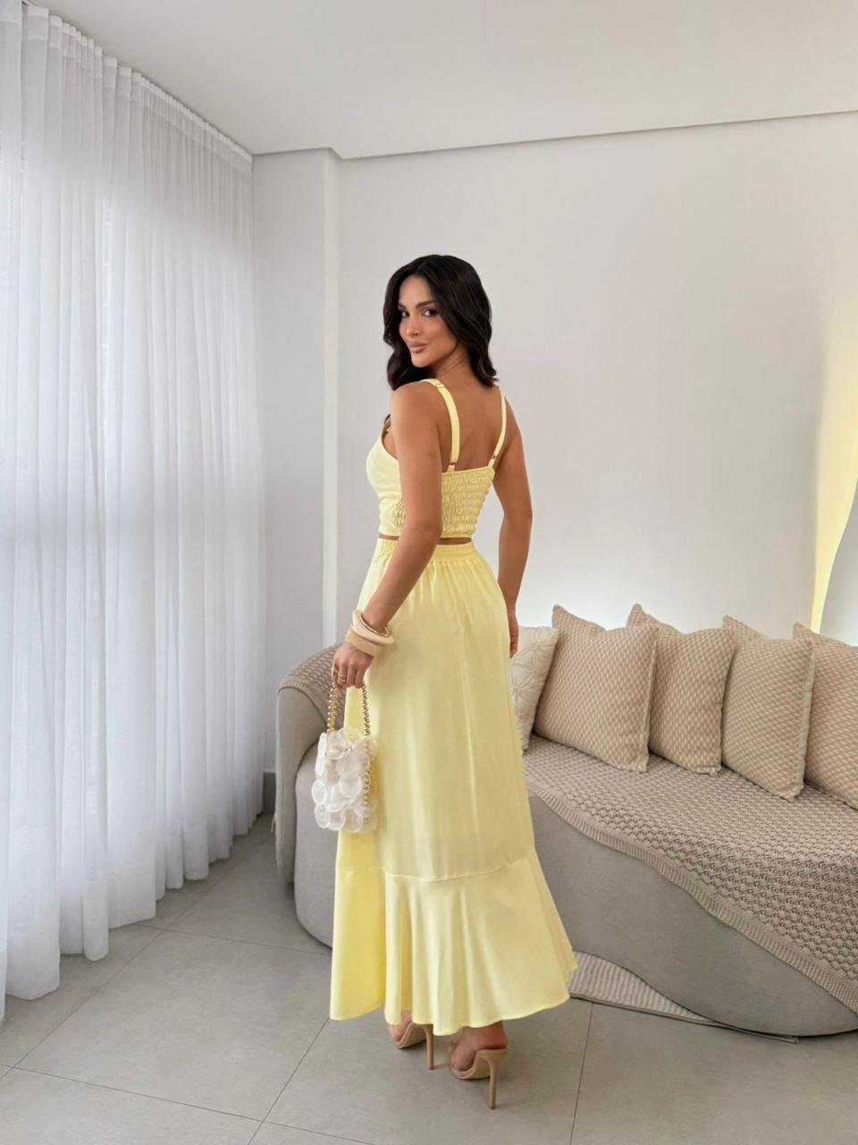 Ocropped apresenta modelagem leve com alças ajustáveis e detalhe com elástico na parte de trás, dando mais conforto ao look. a saia midi, com elástico na cintura para garantir ajuste perfeito ao corpo e proporcionar liberdade de movimentos. O caimento impecável realça a silhueta com delicadeza e elegância.