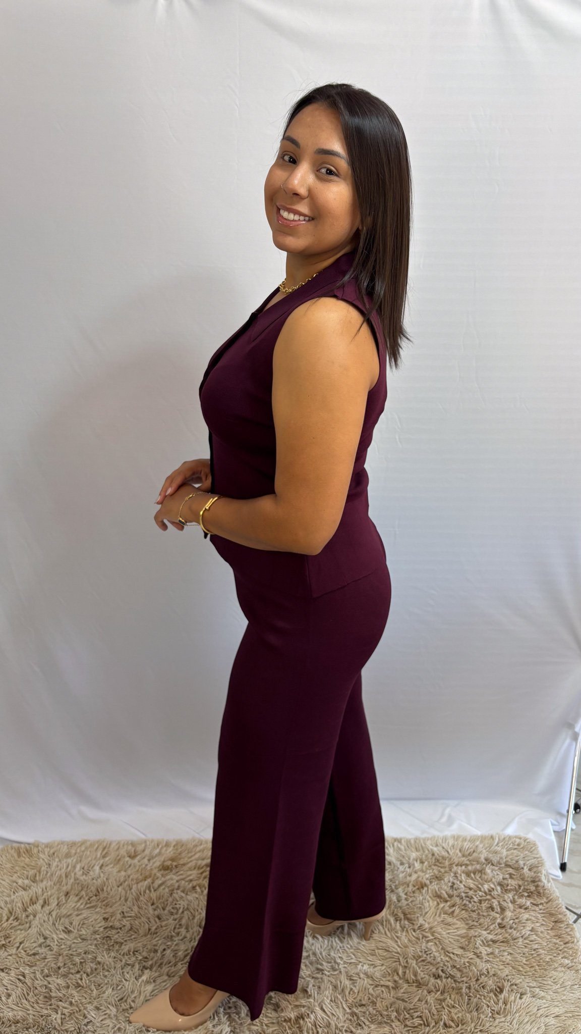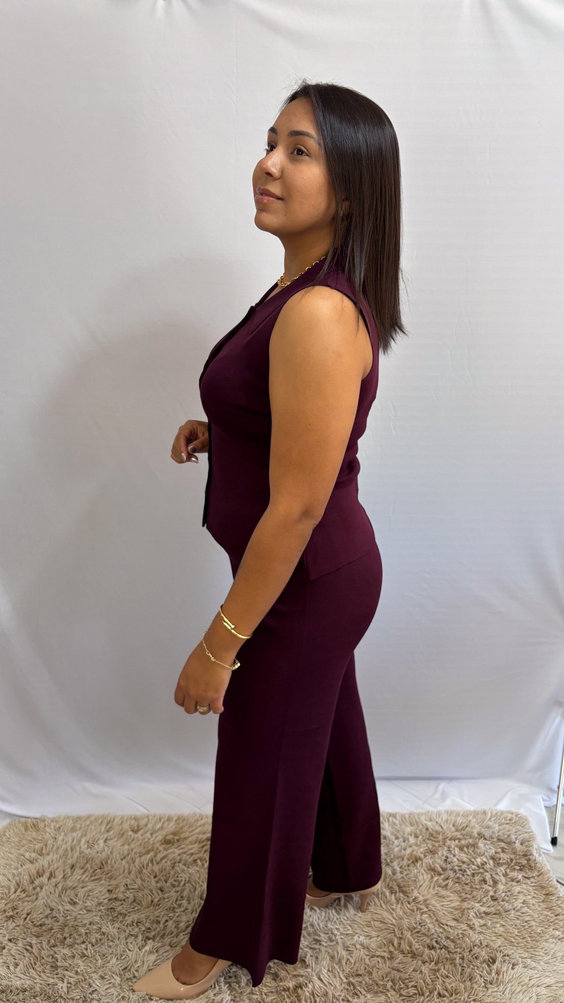 O tom bordo traz frescor e elegância ao look, sendo uma cor versátil que permite diversas combinações com acessórios e calçados. O caimento impecável valoriza a silhueta com delicadeza, criando um visual moderno e confortável.