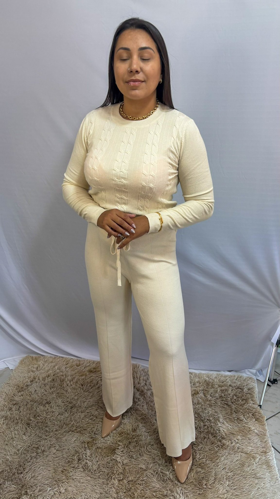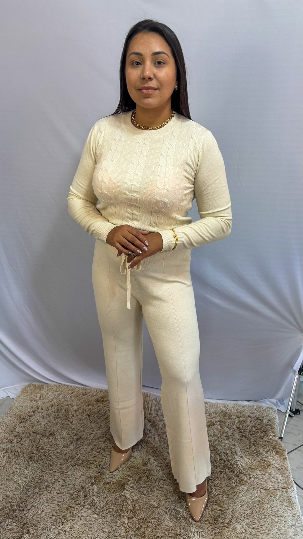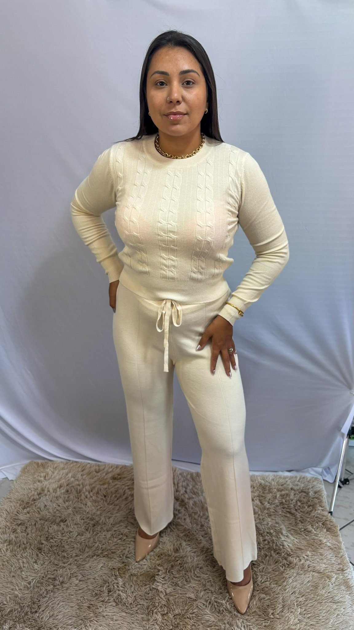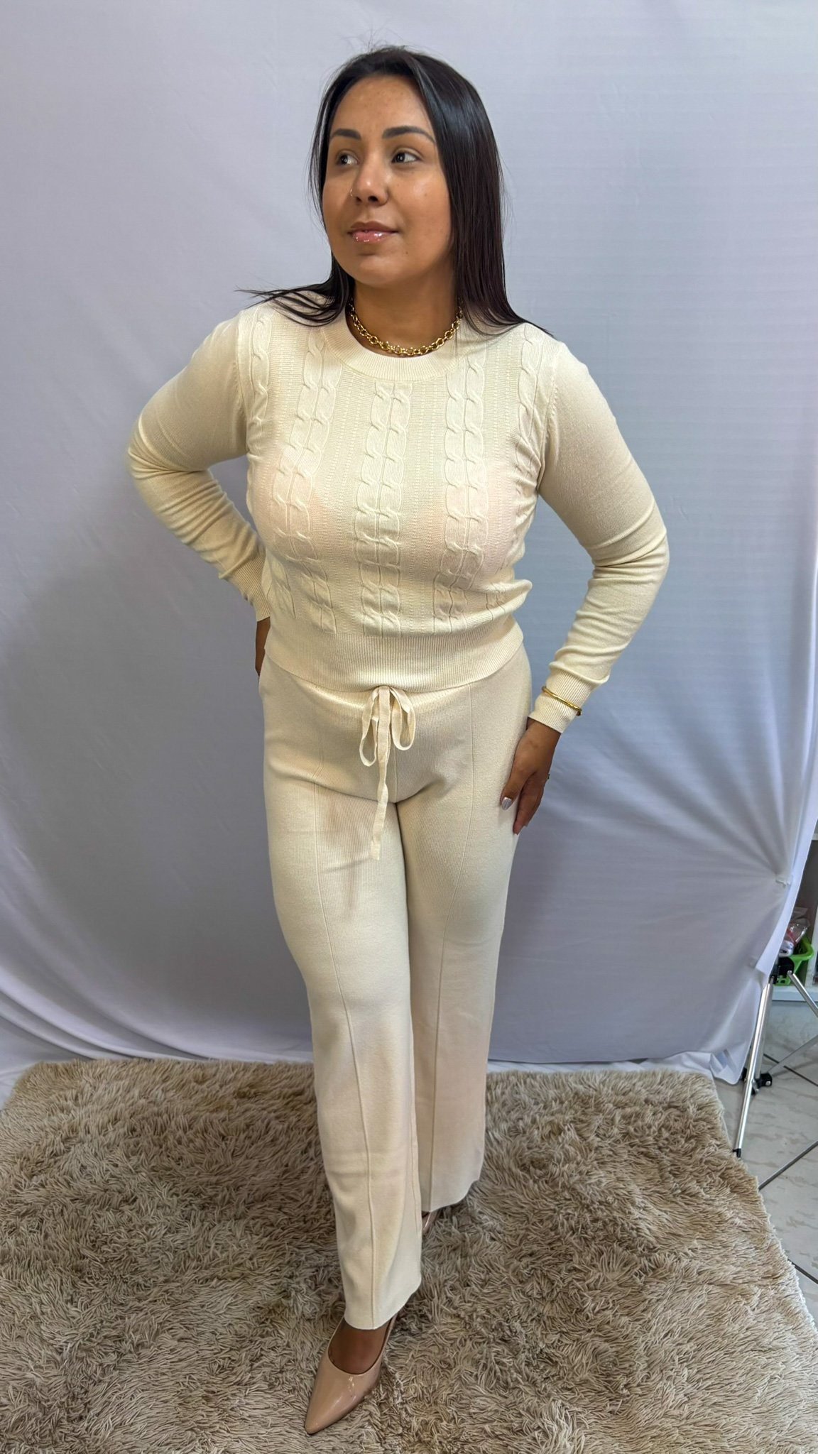 Na imagem, o conjunto aparece em um elegante tom off, composto por blusa de manga longa com textura delicada em relevo e gola redonda, que valoriza o visual com um detalhe sofisticado. A calça de modelagem reta possui cintura com amarração frontal e elástico na parte de trás, garantindo ajuste perfeito ao corpo e proporcionando liberdade de movimentos.