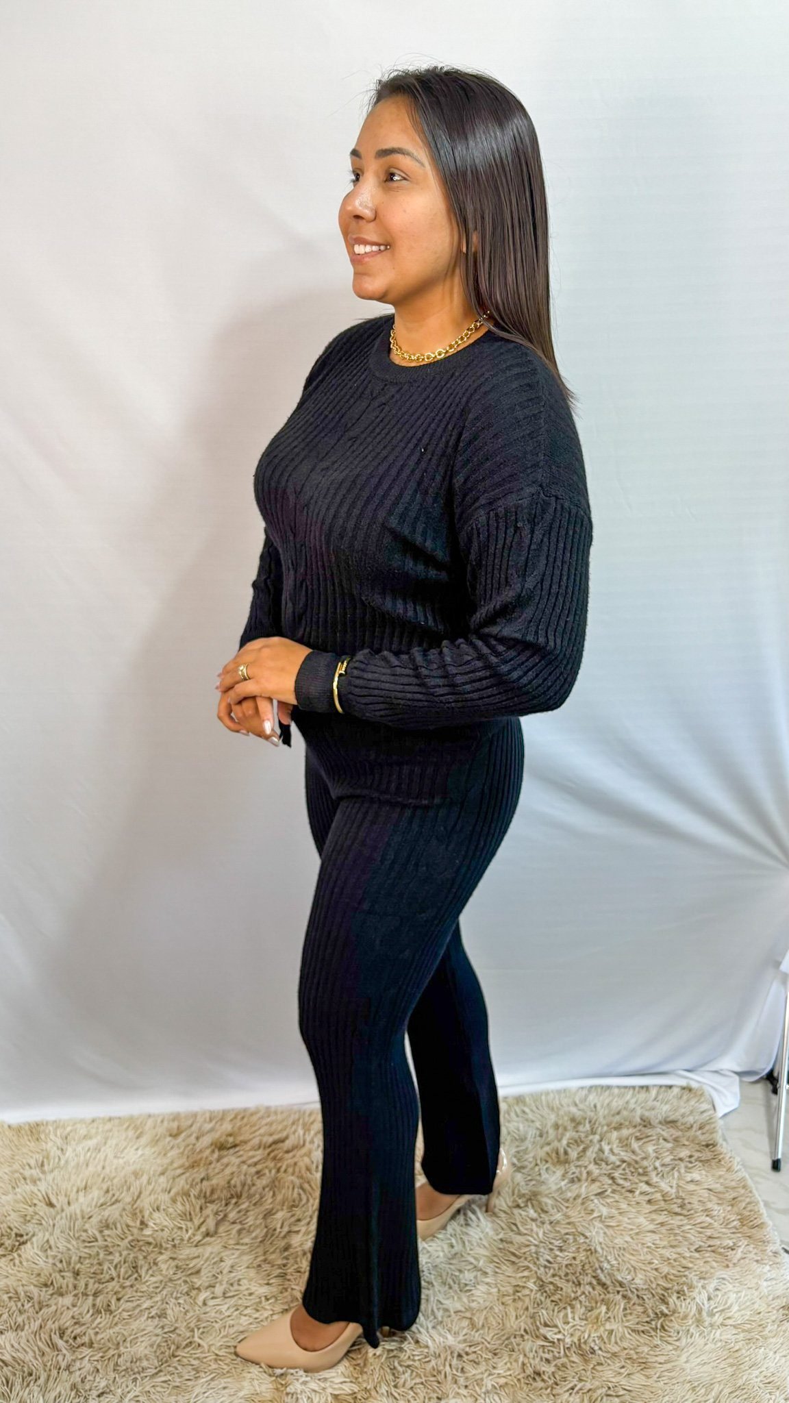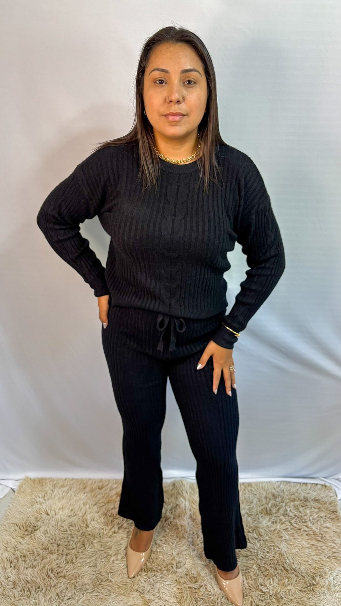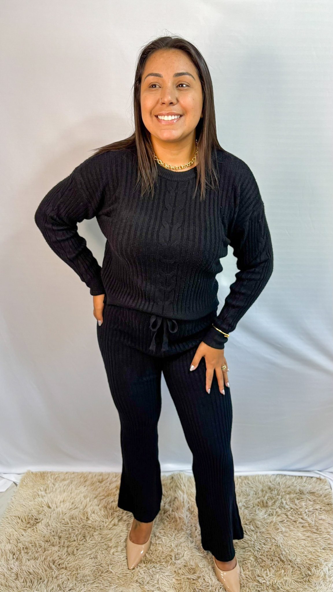 Na imagem, o conjunto aparece em um elegante tom Preto, composto por blusa de manga longa com textura delicada em relevo e gola redonda, que valoriza o visual com um detalhe sofisticado. A calça de modelagem reta possui cintura com amarração frontal e elástico na parte de trás, garantindo ajuste perfeito ao corpo e proporcionando liberdade de movimentos.