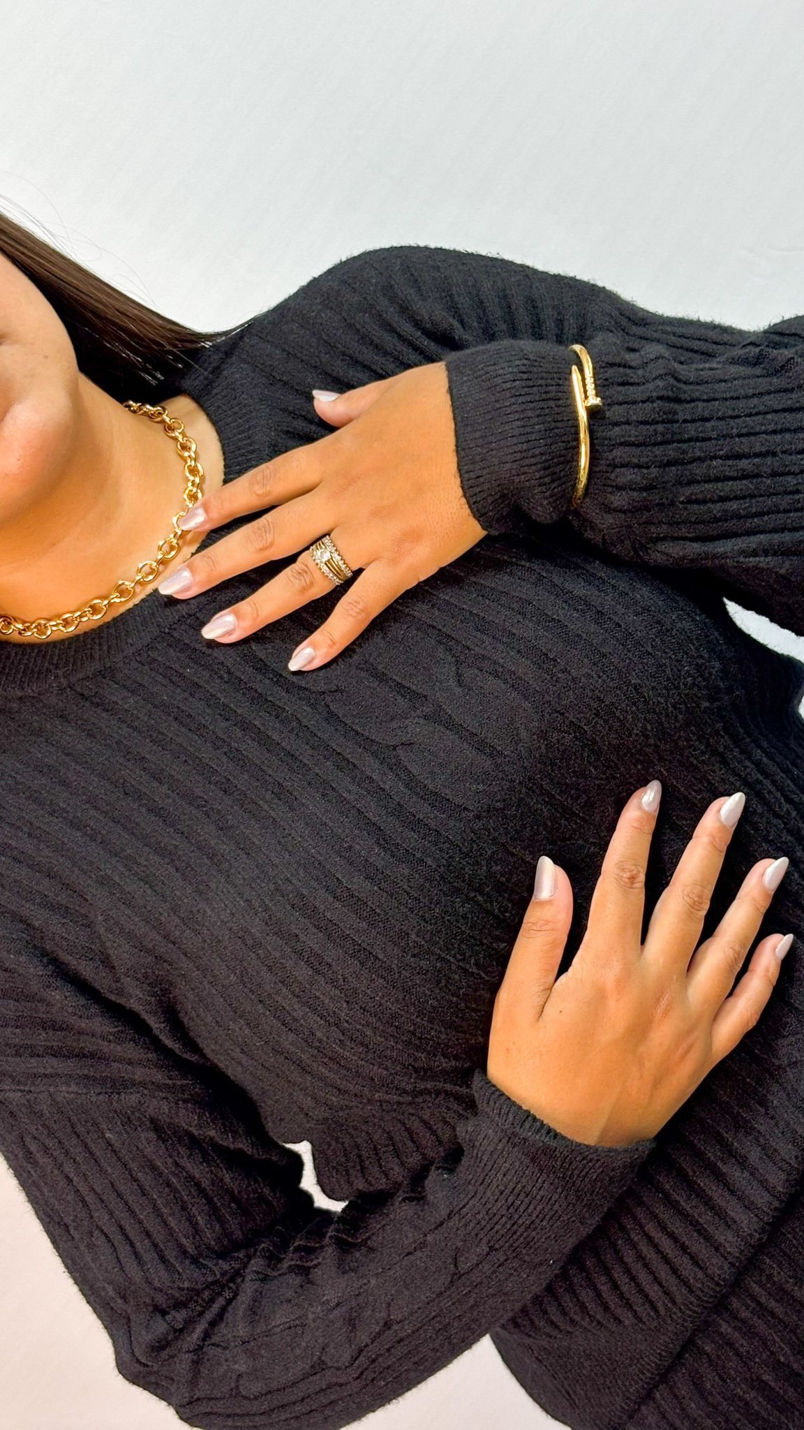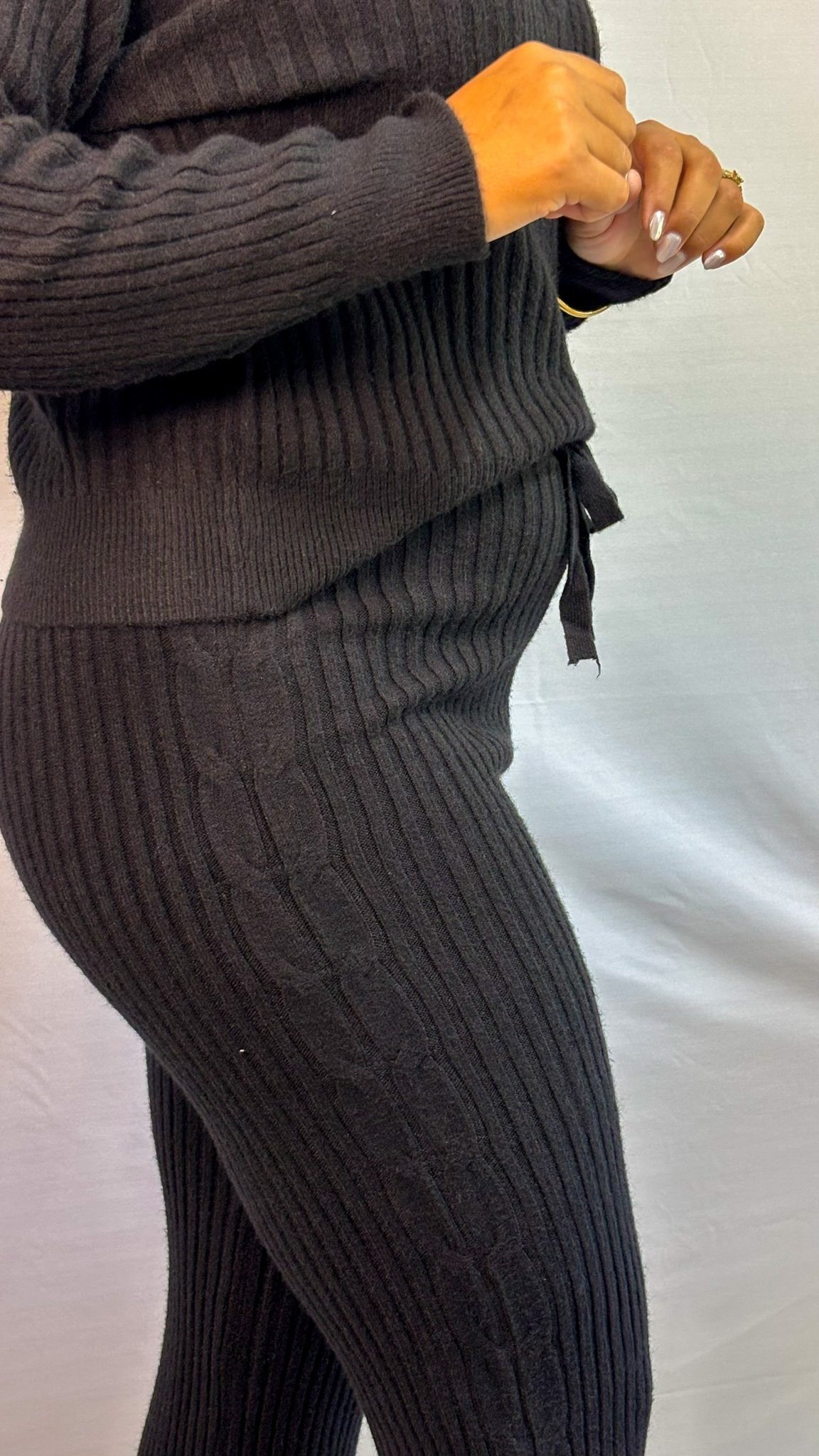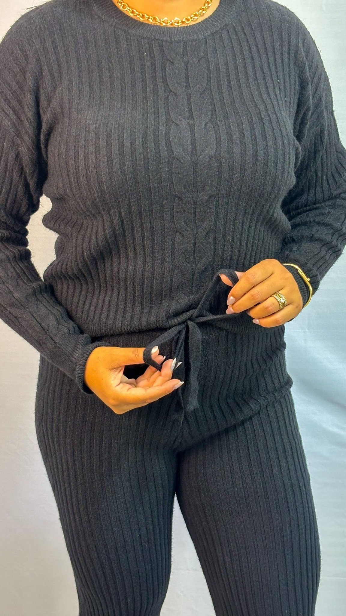 Na imagem, o conjunto aparece em um elegante tom Preto, composto por blusa de manga longa com textura delicada em relevo e gola redonda, que valoriza o visual com um detalhe sofisticado. A calça de modelagem reta possui cintura com amarração frontal e elástico na parte de trás, garantindo ajuste perfeito ao corpo e proporcionando liberdade de movimentos.